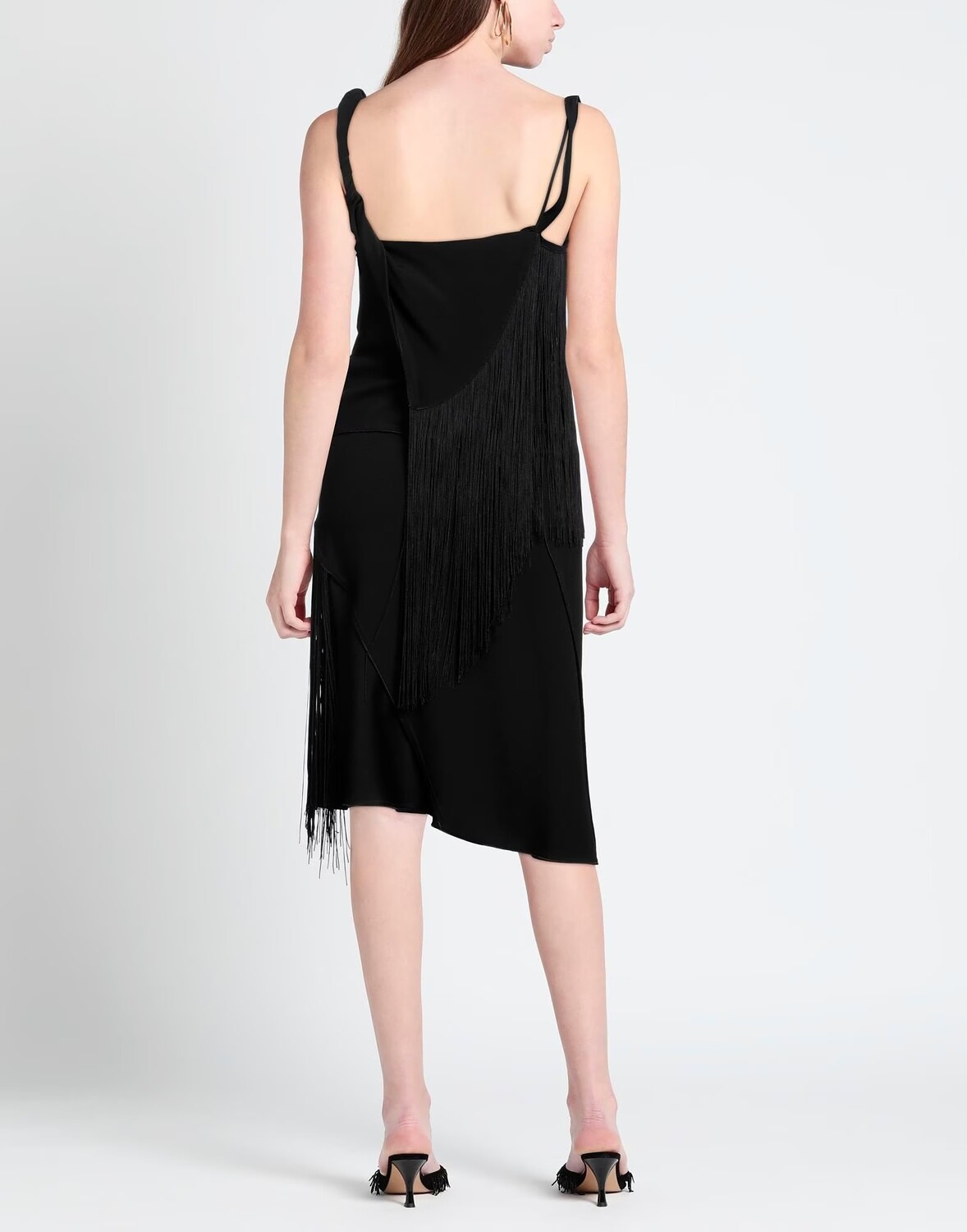Это платье на бретельках и длиной миди сшито из гладкого атласа, а в дизайне имеет бахрому, что делает его фасон не таким классическим и строгим.