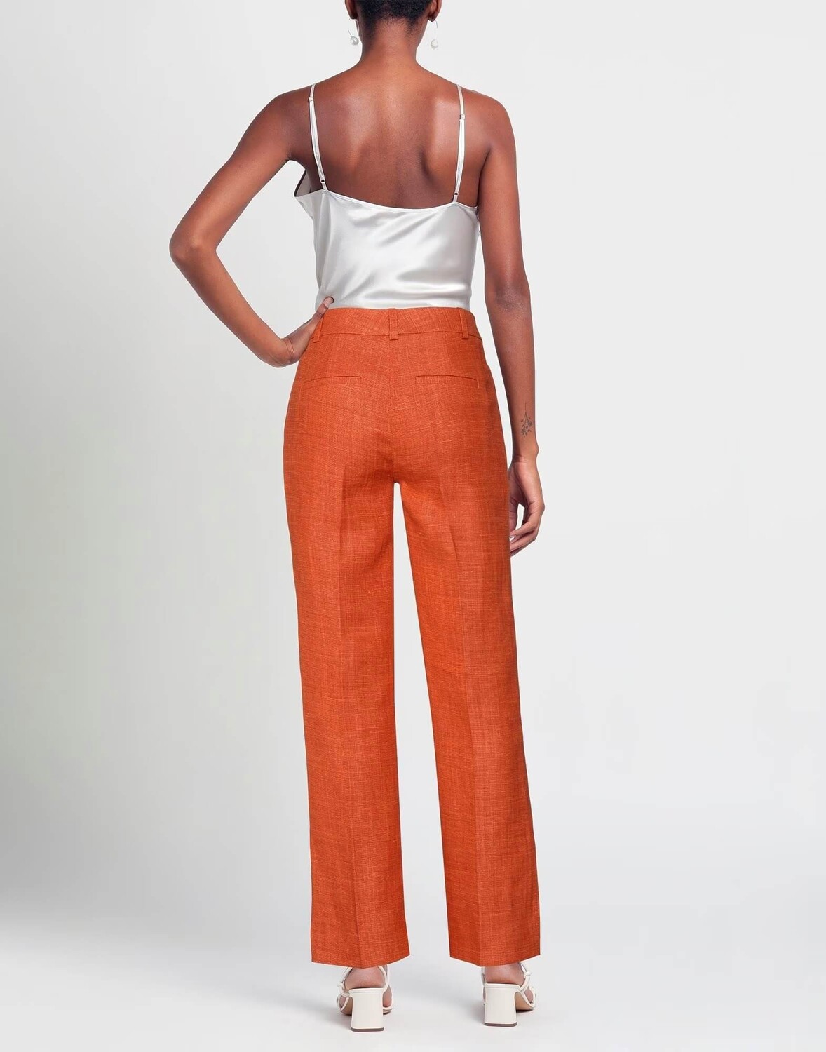 Брюки из льняной ткани обычного кроя, с расклешенными штанинами, с высокой линией талии, застежкой на крючок и молнию, поясом с шлевками для ремня, задними прорезными карманами.