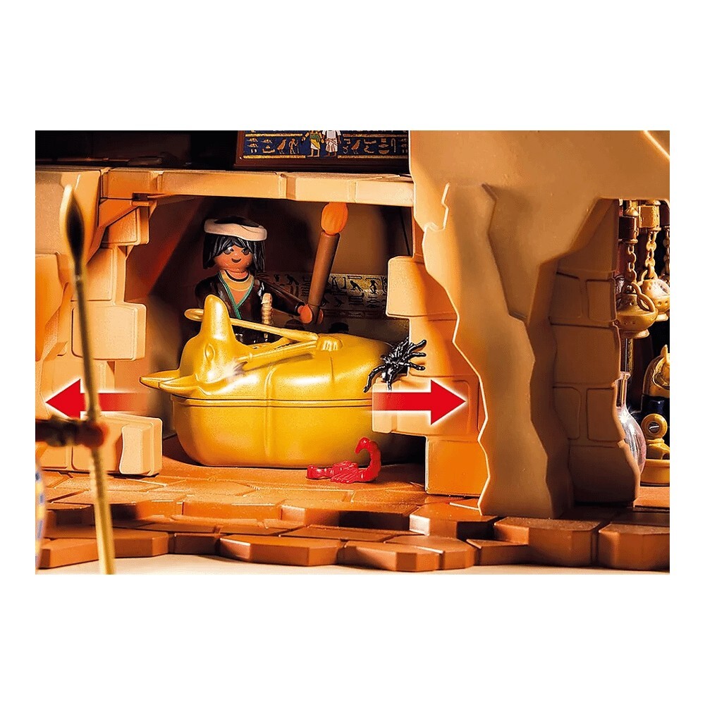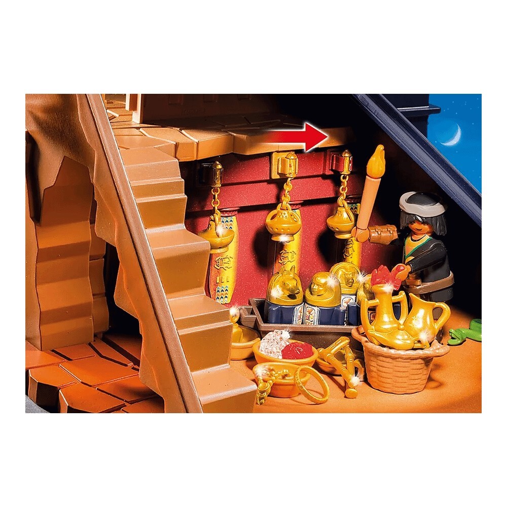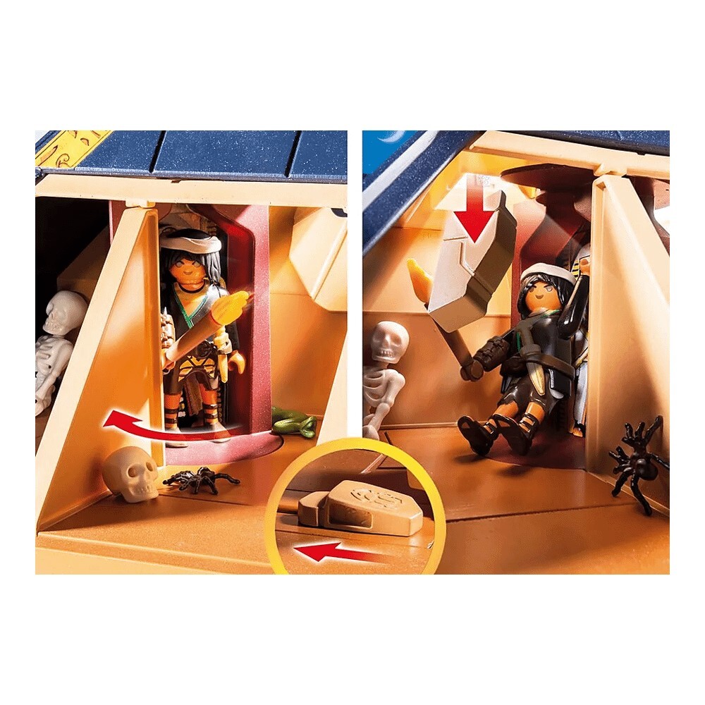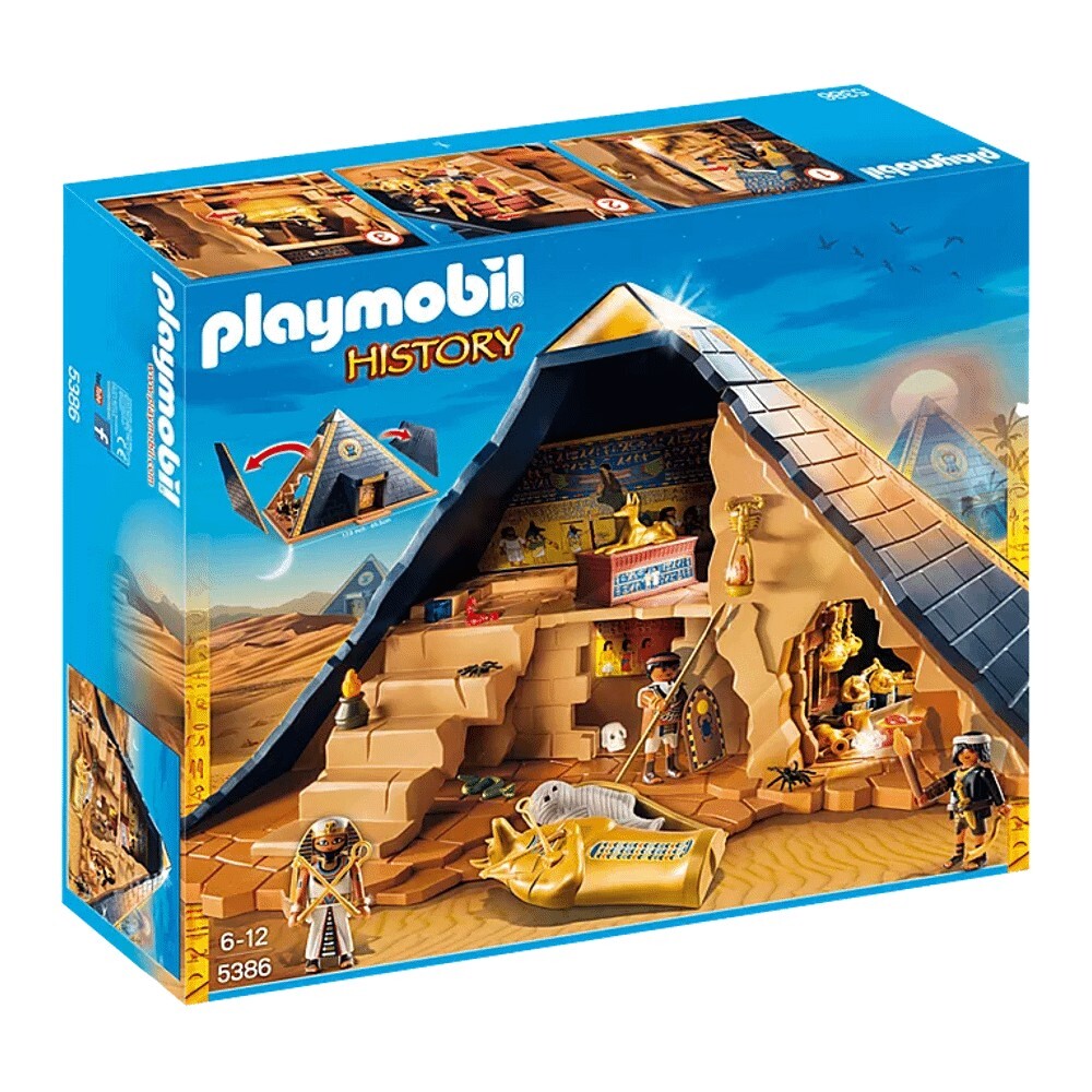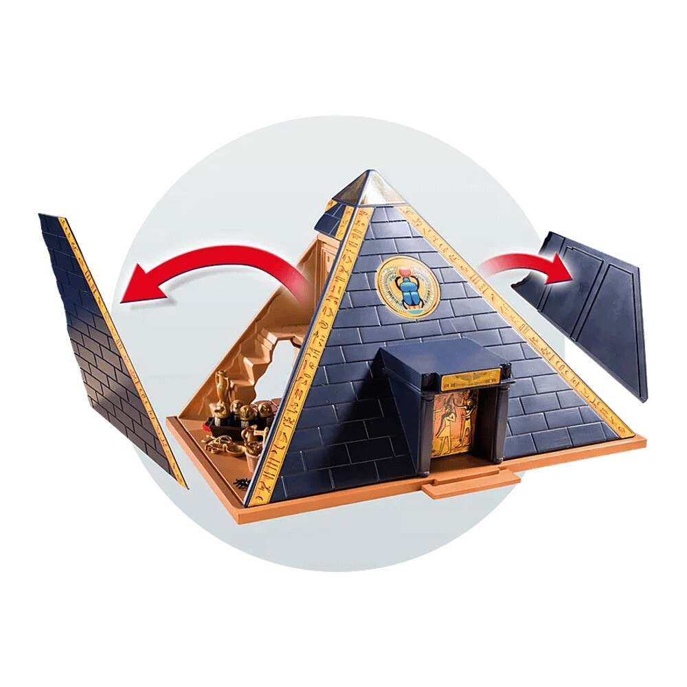 Вместе с Plaimobil отправляйся в увлекательное путешествие! Открой древние тайны пирамиды Фараона. Пять палат внутри скрывают сокровища, которые защищены хитрыми загадками и подлыми ловушками. Исследуй комнату с драгоценностями и золотом или взберись вверх по лестнице и попади в палату с гробницей императора. В саркофаге ты найдёшь его мумию. Будь осторожен, не попадись в ловушку у тебя под ногами. Отодвинув стены пирамиды ты увидишь, что ещё много помещений не изучено. Внимательно оглядывайся, повсюду скелеты и пауки.