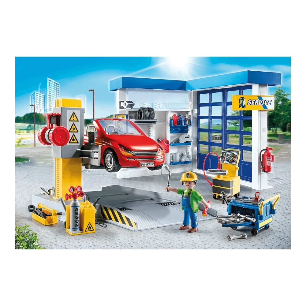 Состав комплекта: пустые фигуры: 1 мастер;Аксессуары: 1 авторемонтная мастерская с воротами и лифтом, 1 кабриолет, 1 шапка, 2 трубки, 1 фонарик, 1 огнетушитель, 1 кронштейн для огнетушителя, 2 шины, 1 воронка, 1 кувшин, 1 брелок, 1 канистра с носиком, 1 инструментальная тележка, 1 телефон, 3 масляные бутылки, 1 фара, 1 сварочный аппарат с газовым баллоном, 1 сварочная маска, 1 тигель, 1 банка, 1 автомобильная батарея, 1 масляная банка, 10 разных автомобильных инструментов, 1 набор инструментов, 1 диагностическое устройство, 1 батарейный кабель