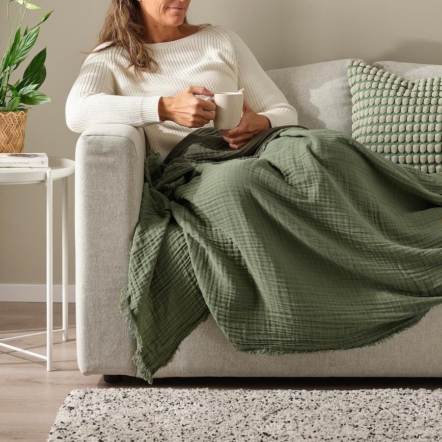 Сверхмягкое покрывало Vallkrassing серо-зеленого цвета на диван или кровать создает непринужденную атмосферу. Многослойный хлопковый муслин имеет гофрированную поверхность, которая хорошо гармонирует с необработанными краями.