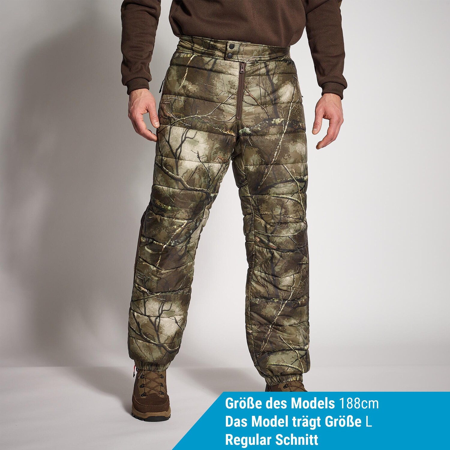 Камуфляж Эксклюзивный принт Treemetic поможет вам слиться с окружающей средой. Легкий вес Одежда весит всего 555 г в размере L/XL, так что вы ее практически не заметите. Легко надевать и снимать Благодаря двум боковым молниям вы можете легко надеть его поверх другой пары брюк. Карманы Две дополнительные молнии обеспечивают легкий доступ к карманам брюк. Водоотталкивающий Внешний материал обработан для защиты от небольшого дождя. Тепловые характеристики Благодаря набивке (150 г/м²) он обеспечивает хороший тепловой комфорт. Компактный В свернутом виде легко фиксируется внутренней резинкой и убирается в рюкзак.
