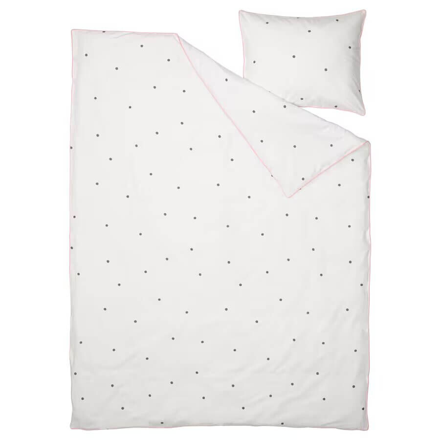 Классное постельное белье в горошек с контрастной окантовкой розового цвета. Изготовлен из смеси хлопка и вискозы, которая обеспечивает равномерную комфортную температуру сна в течение всей ночи, поэтому ваш малыш просыпается отдохнувшим. Застегиваются на молнию.