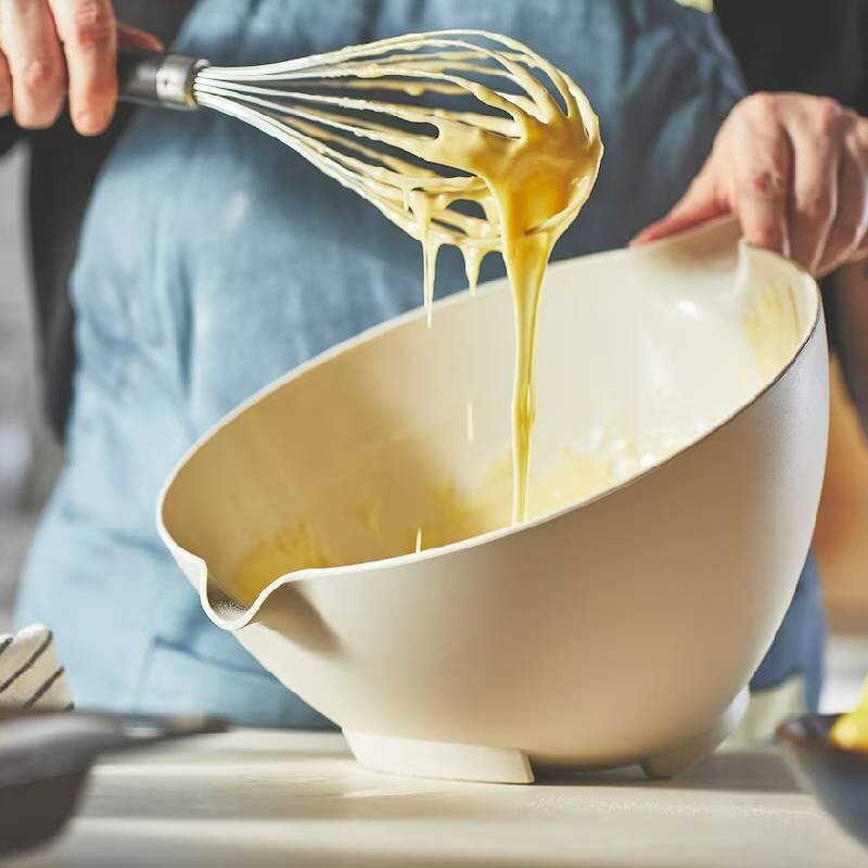 Эту чашу для смешивания можно использовать как в вертикальном, так и в наклонном положении, поэтому ваше положение всегда будет эргономичным. Выливайте тесто, как обычно, или через ручку, если это точная работа.