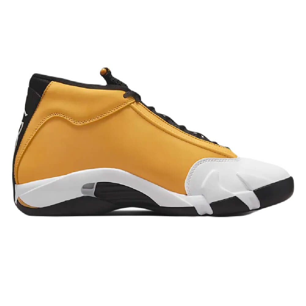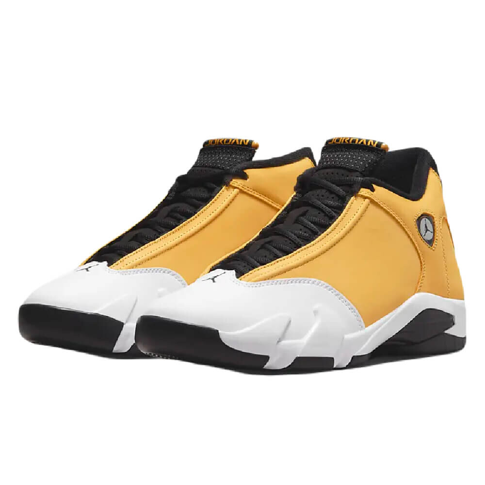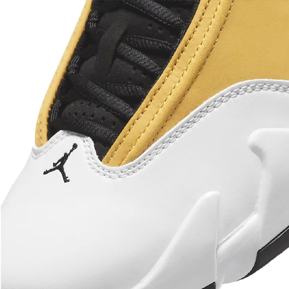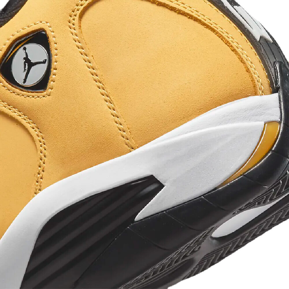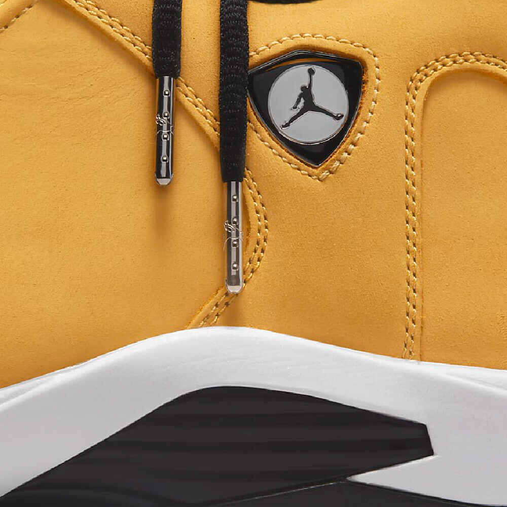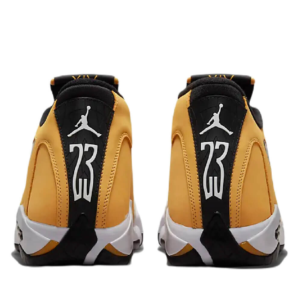 Модель Air Jordan 14 Retro "Ginger" представляет собой переосмысление модели OG Air Jordan 14 Low "Ginger" 1999 года. Верхняя часть обновленной модели выполнена из нубука золотистого оттенка с белой кожаной накладкой на носочной части. Логотипы Jumpman представлены на значке в стиле Ferrari и прорезиненной накладке на пятку с тисненой текстурой протектора шины и крупным брендингом '23'. Промежуточная подошва из материала Phylon с амортизацией Zoom Air дополнена угловатыми зубцами и поддерживается пластиной хвостовика из TPU.