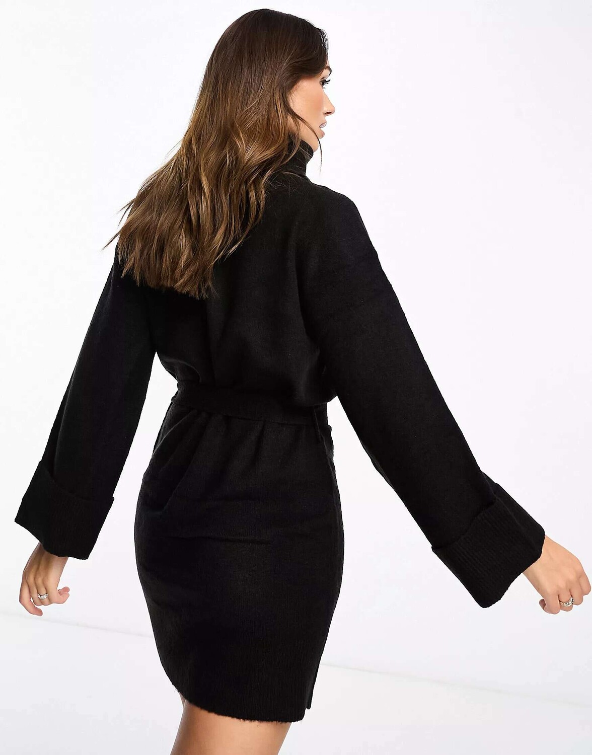 Черное мини-платье-джемпер с высоким воротником и завязкой на талии Vila