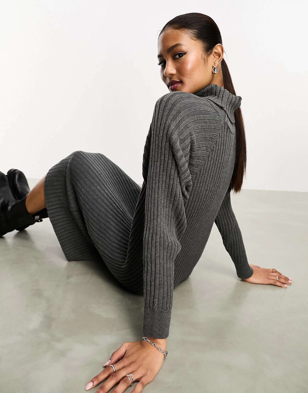 Серое платье миди в рубчик с высоким воротником Y.A.S