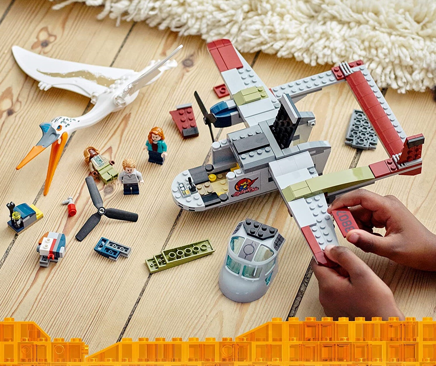 Игрушечный самолет, созданный для действий — кабина с местом для 3 минифигурок, вращающиеся пропеллеры, открывающийся грузовой отсек и двигатели, спроектированные так, чтобы отламываться при атаке и легко снова прикрепляться.