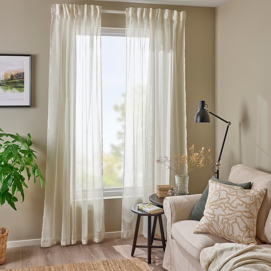 Полупрозрачные гардины Hällebräcka белого цвета создают легкую и воздушную атмосферу и позволяют наслаждаться видом на улицу.
