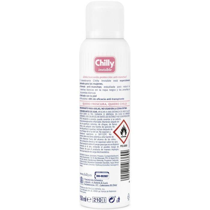Chilly Invisible Deodorant Spray: Невидимый дезодорант Chilly специально разработан исключительно для женщин. Он представляет собой формулу против пятен, которая обеспечивает защиту от пота и направлена на уменьшение образования белых пятен на черной одежде и образования желтых пятен на белой одежде. Кроме того, он содержит витамин Е, антиоксидантные свойства которого помогают бороться со свободными радикалами, которые являются одной из причин старения клеток кожи. До 48 часов защиты. Нежная формула 0% спирта. Идеально подходит для женщин, которым нужна деликатность и защита.