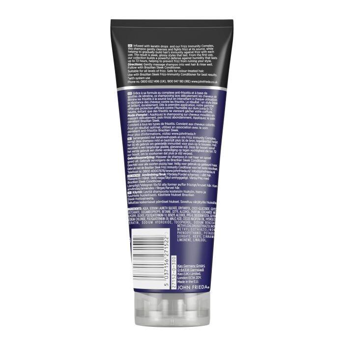 Шампунь John Frieda Brasilian Sleek предотвращает вьющиеся волосы, придавая им стойкий и элегантный вид. Выпрямляющий шампунь, обогащенный новым комплексом Frizz Immunity Complex, который смягчает, увлажняет и восстанавливает естественную защиту от пушения. Смешайте его с кондиционером Brazil Sleek, чтобы улучшить внешний вид и сделать волосы шелковистыми. Содержит кератиновые капли для достижения мягких и гладких волос. Особенно рекомендуется для средних и густых, волнистых или вьющихся волос.