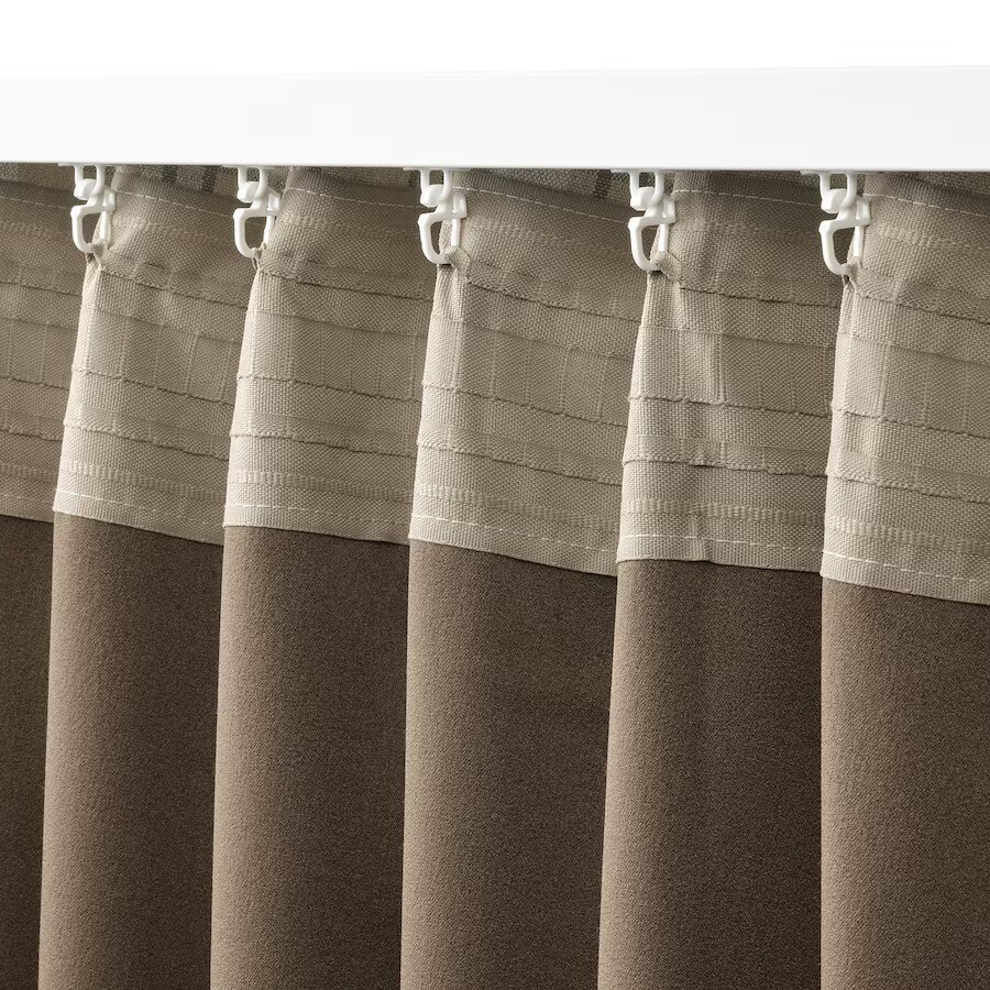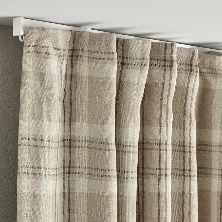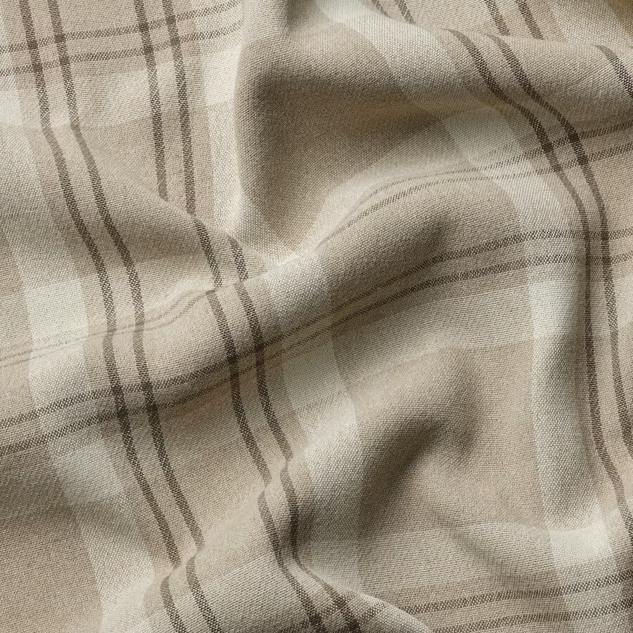 Затемняющие комнату гардины Häggveckmal из ткани, которая выглядит как шерстяная, с классическим узором в бежевую клетку и подходящей подкладкой создают ощущение уединения. Благодаря длине 300 см полотно гардин красиво драпируется мягкими складками.