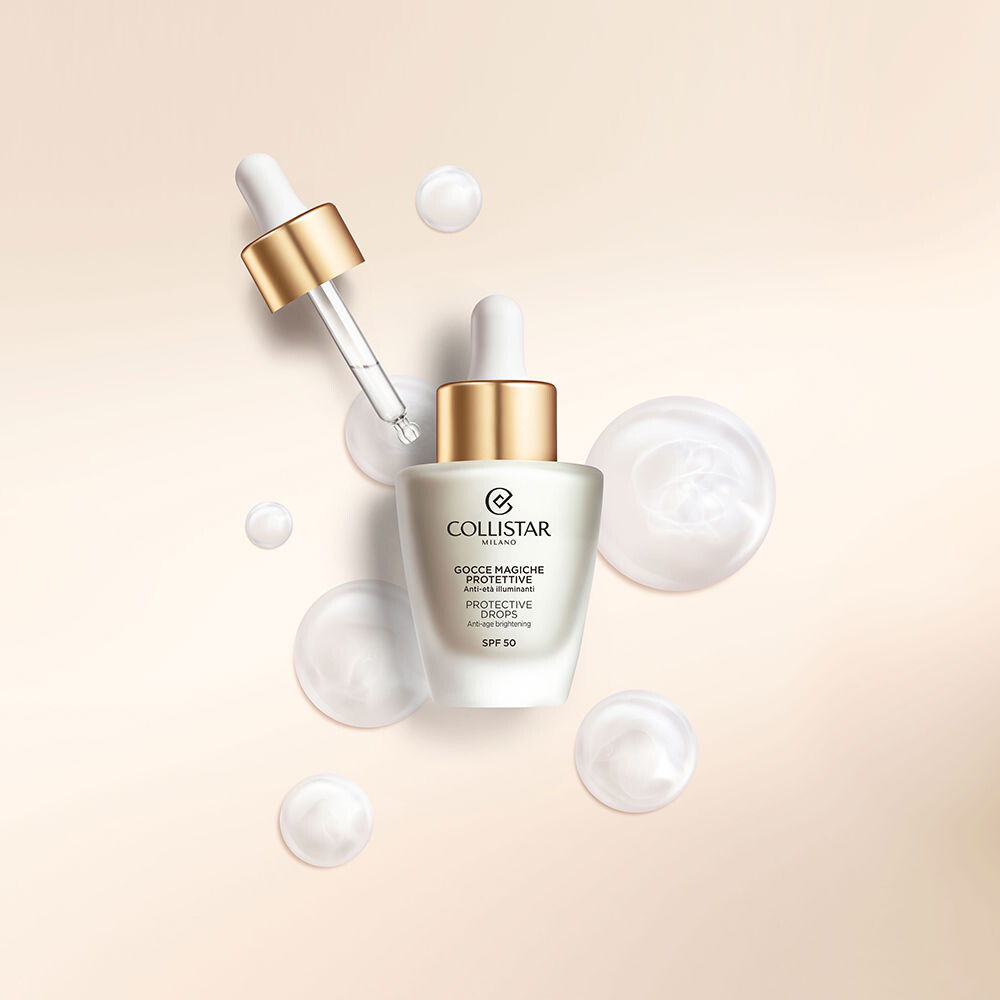 COLLISTAR MAGIC ANTI-AGING PROTECTIVE DROPS SPF50+. Новый шаг в рутине красоты с инновационной формулой, необходимой для тех, кто стремится предотвратить признаки старения и пятна на коже: ЕЖЕДНЕВНАЯ ЗАЩИТА теперь является первым жестом против старения. Содержит SMART SUN PROTECTION, инновационная система фильтров провитамина D: активирует витамин здоровья и останавливает только вредное излучение, усиливая влияние света на самочувствие и красоту кожи. Защищает кожу на открытых участках в течение всего года (лицо, шея-декольте и руки) от воздействия окружающей среды, загрязнения, UVA/UVB и ИК-излучения, а также синего света – всех факторов, ответственных за старение кожи и появление дисхромии. Формула обогащена ниацинамидом, обладающим антивозрастным и осветляющим действием, а также гиперферментированной итальянской рисовой водой, специальным устойчивым итальянским активным ингредиентом с гомогенизирующим и антиоксидантным действием. Его волшебная текстура чрезвычайно легкая и жидкая, ультрачувствительная, она легко распределяется и сливается с кожей, создавая идеальный слой в качестве основы под макияж. Результаты: КЛИНИЧЕСКИ ДОКАЗАННАЯ ЭФФЕКТИВНОСТЬ. Защита от повреждений от воздействия солнечных лучей в городе, уменьшение выцветания и осветляющий эффект. Устойчив к поту даже во время занятий спортом. Дерматологически протестировано, контроль содержания никеля.
