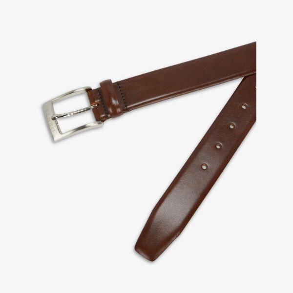 Помят кожаный ремень. 100% кожа. Застежка на пряжку спереди. Фирменный принт на пряжке, петля для ремня, пять отверстий, гладкая кожа, внутренний логотип из фольги. Специализированная чистка кожи. Сделано в Англии. Легкий, не растягивается.