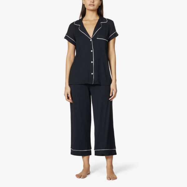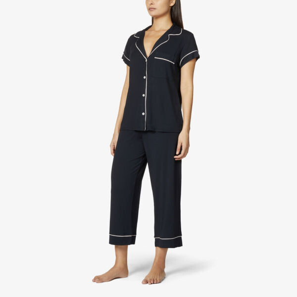 Пижамный комплект Eberjey из эластичного трикотажа. 95% модал, 5% эластан. Застежка на пуговицы. Вершина:. Кемпинговый воротник, короткие рукава, один накладной карман на груди, контрастная окантовка, перламутровые пуговицы. Низ:. Свободный крой, средняя посадка, укороченные прямые брючины, эластичный пояс, контрастная окантовка. Ручная стирка.