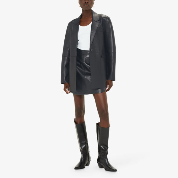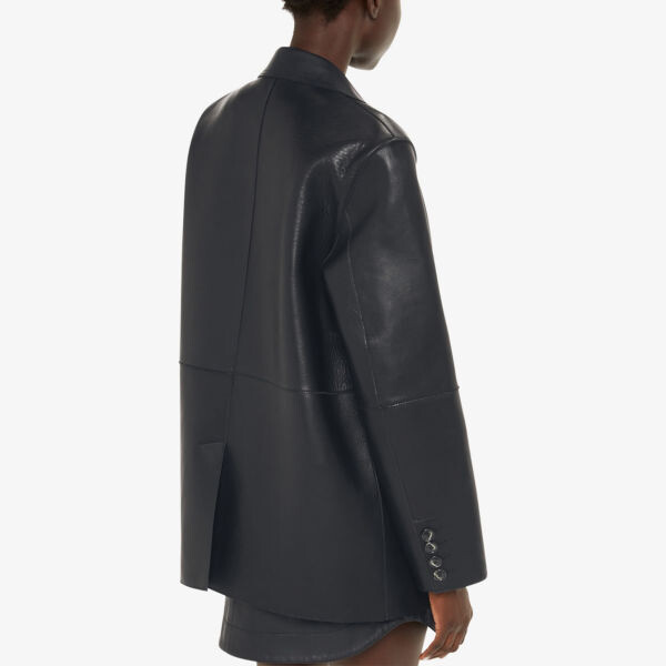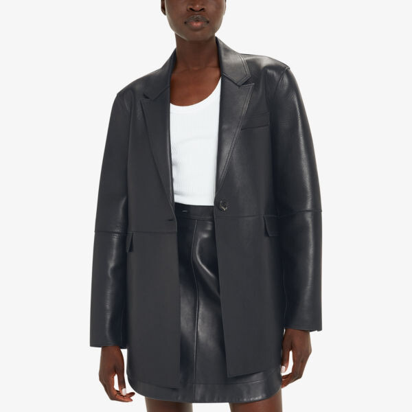 Кожаный пиджак Whistles. 100% овчина. Застежка на открытые пуговицы спереди. Свободный крой, остроконечные лацканы, длинные рукава, манжеты на пуговицах, застежка на одну пуговицу спереди, прорезной карман на груди, боковые карманы с клапанами, одинарная шлица сзади по краю. Специализированная чистка кожи.