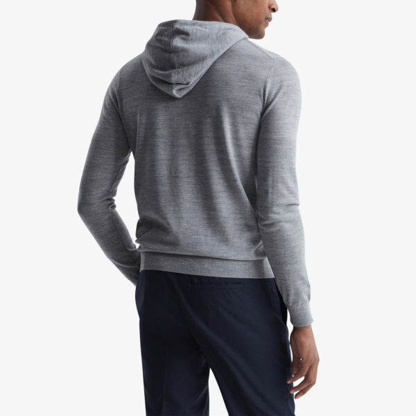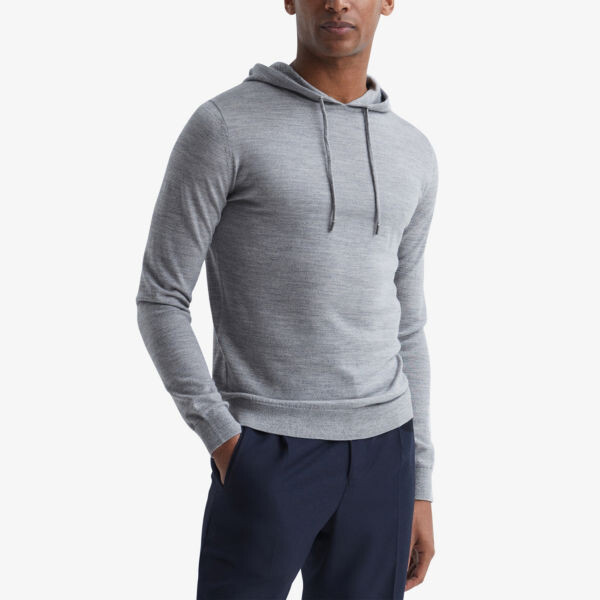 Вязаная толстовка Reiss из шерсти. Тянет. Классический крой, капюшон на шнурке, длинные рукава, тонкая вязка, фирменная фурнитура серебристого цвета, ребристая отделка. Ручная стирка в холодной.