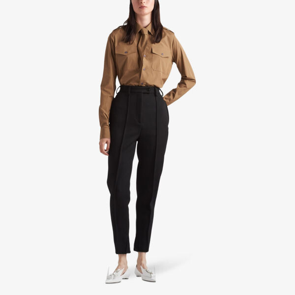 Брюки Prada из смесовой ткани. 97 % натуральная шерсть, 2 % полиамид, 1 % эластан. Застегивается на пуговицы и молнию. Высокая посадка, узкие брючины, петли для ремня, прижатые центральные складки. Только специализированная химчистка. Средняя плотность, небольшая растяжимость. Обратите внимание: мы не можем принимать возвраты заказов Prada из магазина.