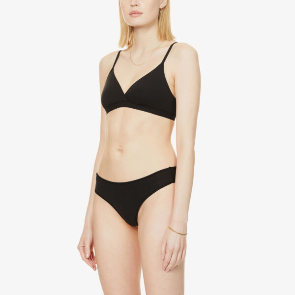 Бюстгальтер SKIMS из эластичной ткани. 76 % нейлон, 24 % эластан; подкладка 84% полиамид, 16% эластан. Скрытое крепление. V-образный вырез, регулируемые бретели, присборенные чашки, бесшовная резинка снизу. Ручная стирка. Легкий, эластичный.