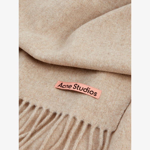 Шерстяной шарф Acne Studios. 100% шерсть. Вышитая фирменная нашивка спереди, сатиновая текстура по всей поверхности, бахрома по краям. Только сухая чистка. Сделано в Италии. Размеры: длина 200см х ширина 70см.
