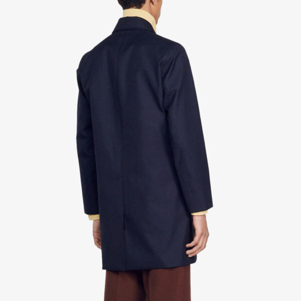 Пальто Sandro. 43 % полиэстер, 37 % шерсть, 20 % полиуретан; подкладка корпуса 100% полиэстер; подкладка рукавов 65% ацетат, 35% вискоза; подкладка кармана 100% хлопок. Потайная застежка на пуговицы спереди. Классический крой, длинные рукава, раздвинутый воротник, прямой крой, водонепроницаемый материал, два боковых накладных кармана на пуговицах, прямой низ, полностью на подкладке, центральная шлица сзади. Сухая чистка. Средней плотности, не тянется.