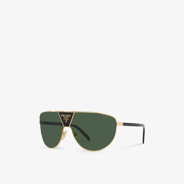 Металлические солнцезащитные очки Prada. Каркас 100% металл; линза 100% поликарбонат. Номер модели: PR 69ZS. Свободный крой, золотистая фурнитура, бляшка с логотипом спереди, регулируемые носовые упоры, принт с логотипом на линзах, затемненные линзы, тонкие дужки, изогнутые кончики. Форма рамы: щит. Размеры: Ширина линзы 13,7см, размер перемычки 1см, длина заушников 13см. Протрите чистой сухой тканью.