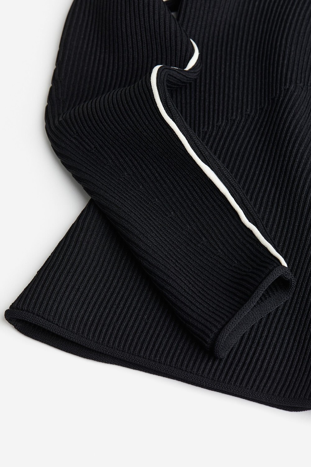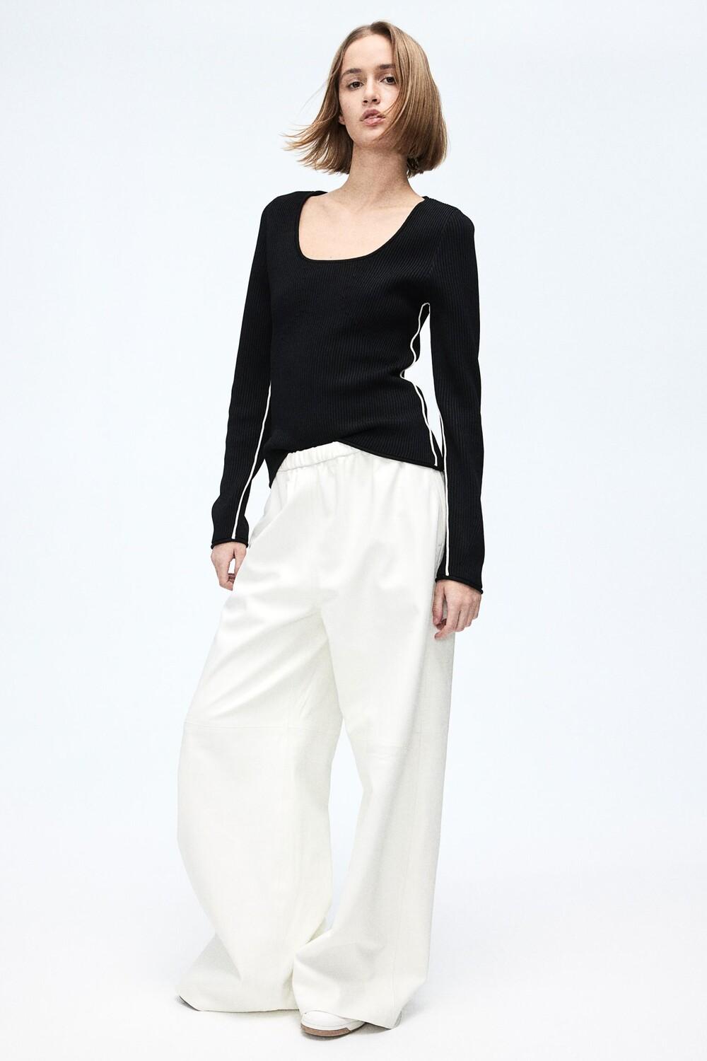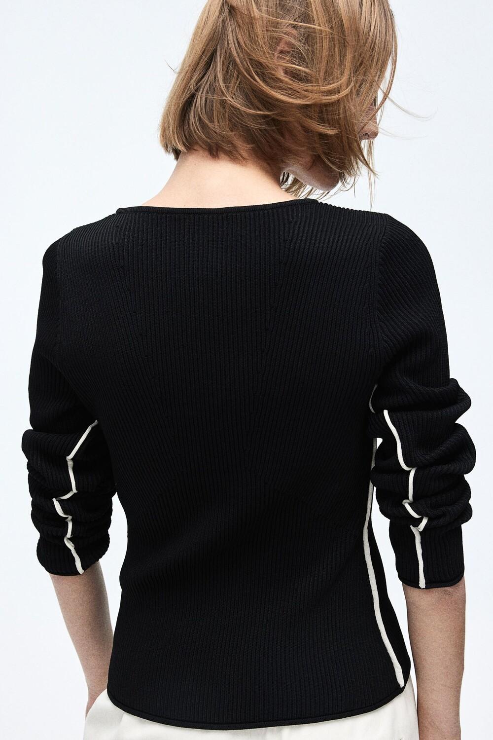 Трикотажный топ в рубчик, подчеркивающий фигуру. Контрастные детали по бокам и вдоль рукавов. Глубокий вырез, длинные рукава с закатанным краем.