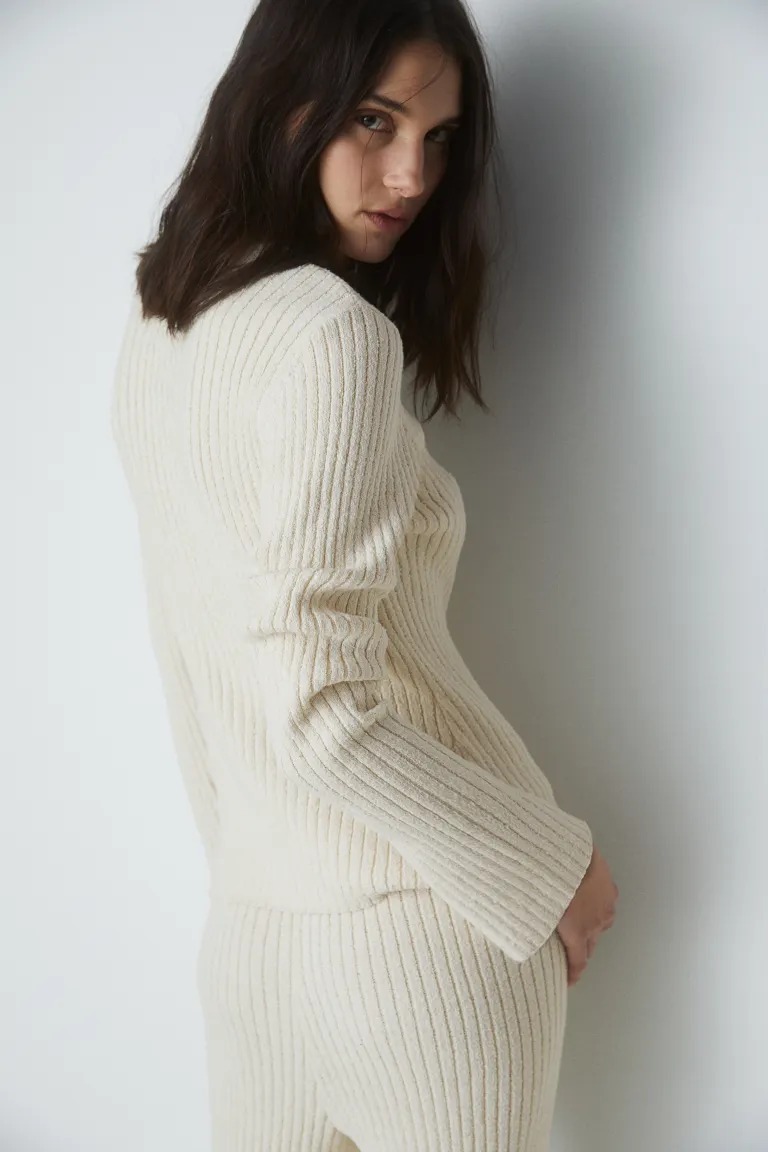 Мягкие брюки эластичной вязки. Высокая талия, эластичный пояс и узкие брючины, расклешенные к низу.