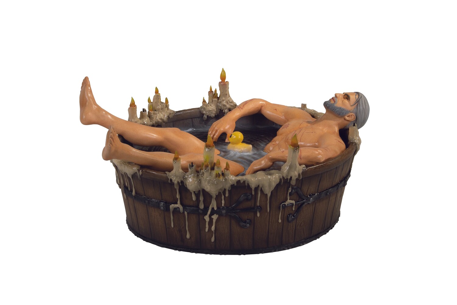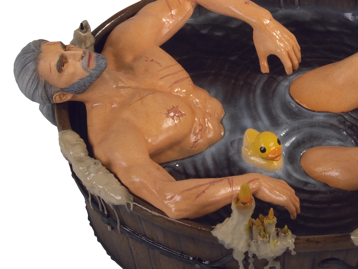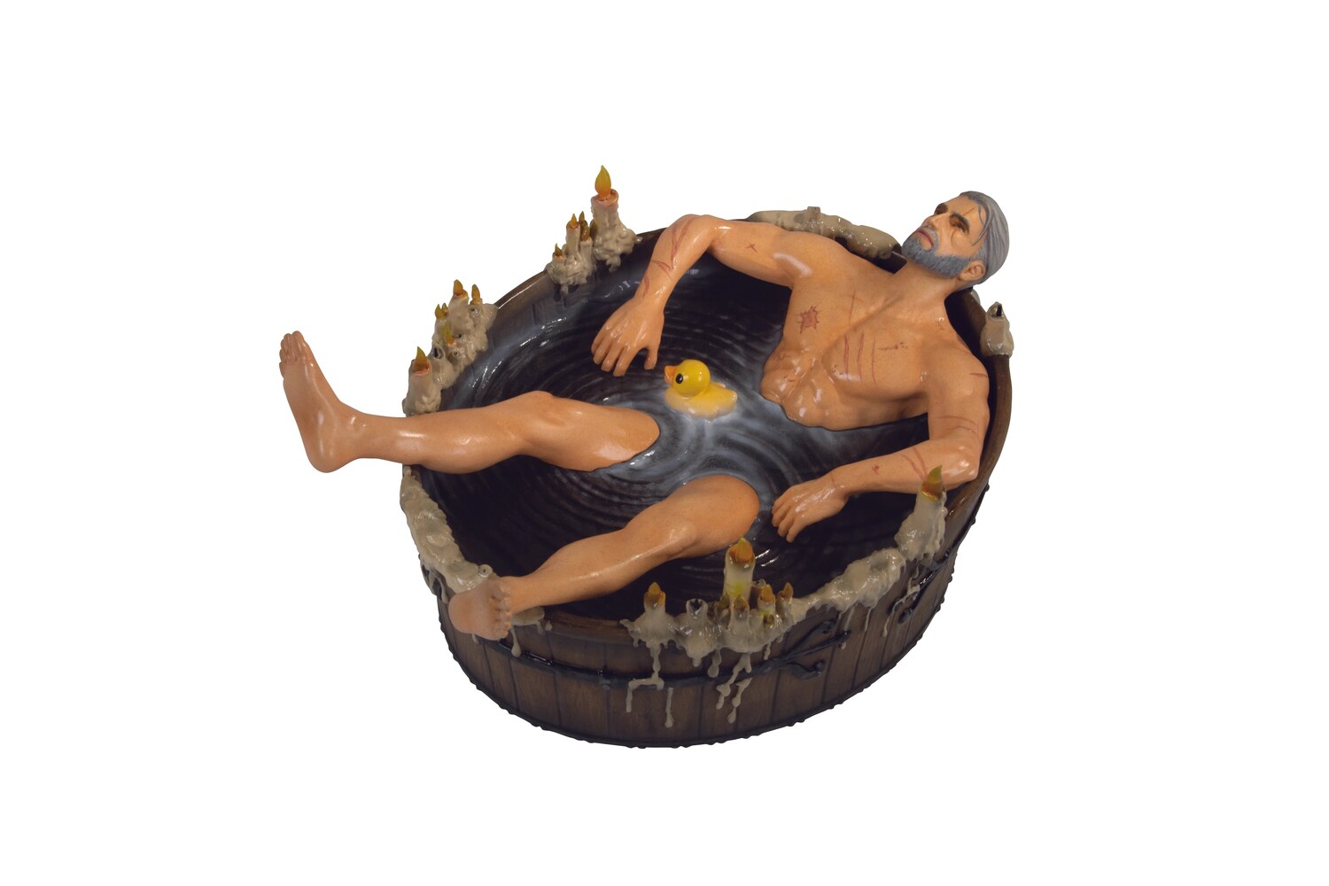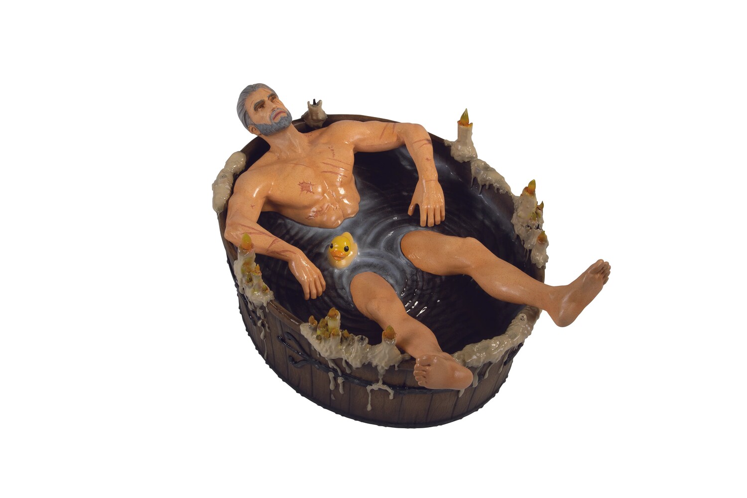 Изначально это была сюжетная сцена из игры, ставшая интернет-мемом, первоапрельской шуткой CD Projekt Red, но спрос на нее со стороны фанатов Witcher стал слишком велик, чтобы его выдержать. Dark Horse с гордостью представляет вам эту удивительно детализированную, 20,3 Д x 8,9 Ш x 13,9 В, раскрашенную вручную статуэтку из полирезины, изображающую Геральта из Ривии, расслабляющегося и исцеляющегося после своих опасных путешествий, в ванной при свечах, вместе с его резиновой уточкой!