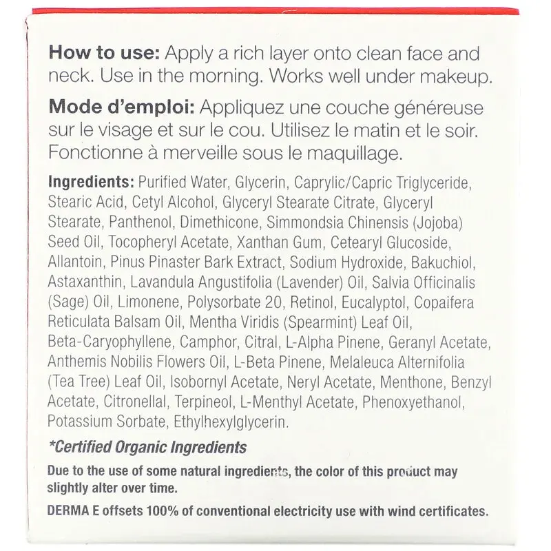 Очищенная вода, глицерин, каприловый/каприновый триглицерид, стеариновая кислота, цетиловый спирт, цитрат глицерилстеарата, глицерилстеарат, пантенол, диметикон, масло семян simmondsia chinensis (жожоба), токоферилацетат, ксантановая камедь, цетеарилглюкозид, аллантоин, экстракт коры сосны. , гидроксид натрия, бакучиол, астаксантин, масло лаванды узколистной (лаванды), масло шалфея (шалфея), лимонен, полисорбат 20, ретинол, эвкалиптол, масло бальзама копайфера ретикулата, масло листьев мента виридиса (мяты курчавой), бета-кариофиллен, камфора, цитраль, l-альфа-пинен, геранилацетат, масло цветков Anthemis nobilis, l-бета-пинен, масло листьев melaleuca alternifolia (чайного дерева), изоборнилацетат, нерилацетат, ментон, бензилацетат, цитронеллаль, терпинеол, l-ментилацетат, феноксиэтанол , сорбат калия, этилгексилглицерин.