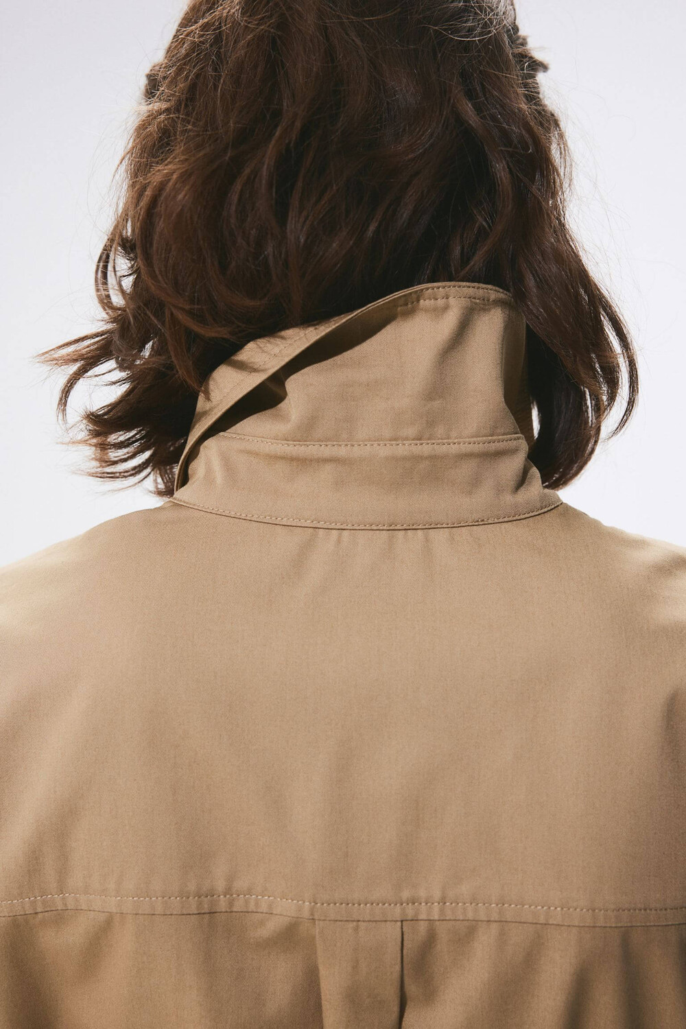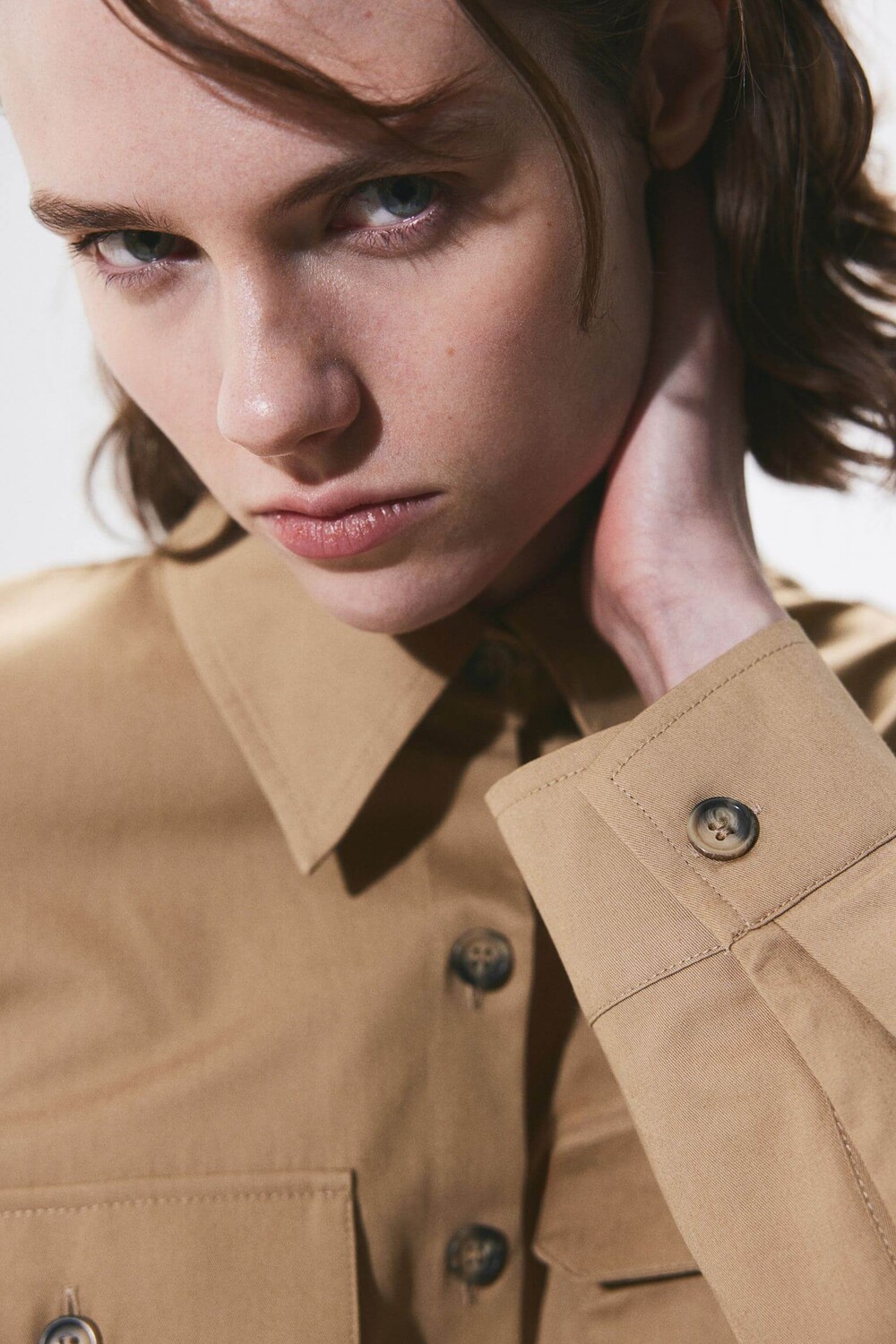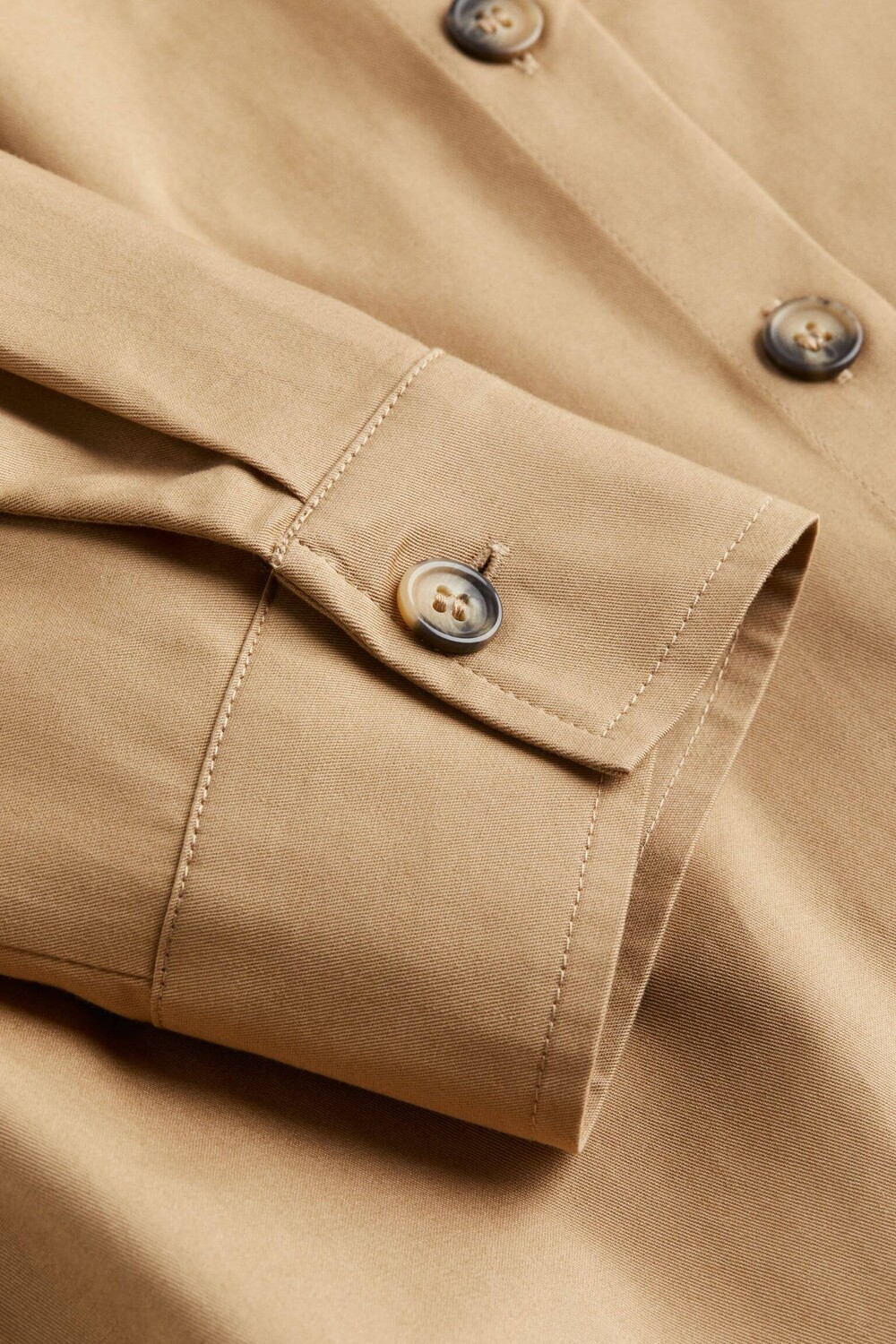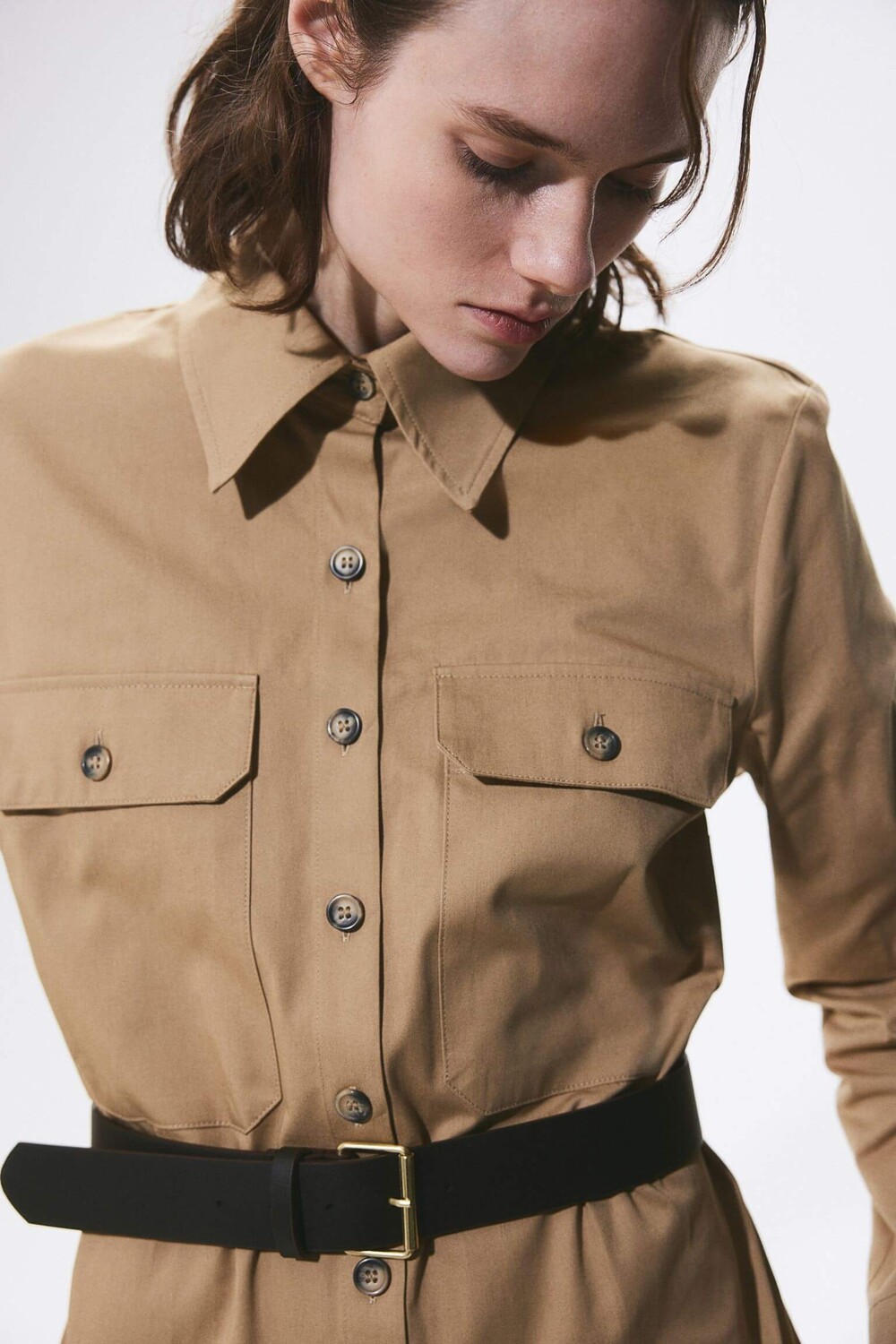 Длинная рубашка из хлопкового твила. Заостренный воротник, застежка на пуговицы, длинные рукава с застегнутой манжетой. На груди карманы с клапаном и пуговицей, сзади кокетка. Съемный поясной ремень.