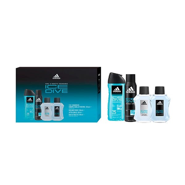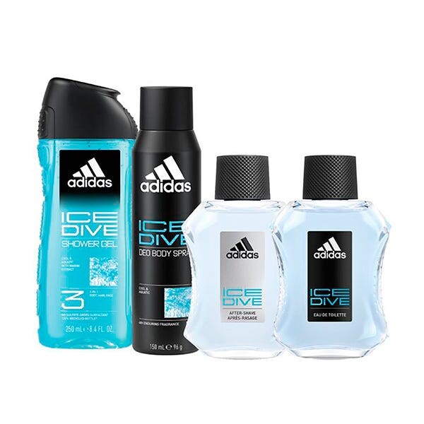 Набор Adidas Ice Dive для мужчин. Содержит 100 мл туалетной воды, 150 мл спрея для тела, 250 мл геля для душа и 100 мл после бритья.