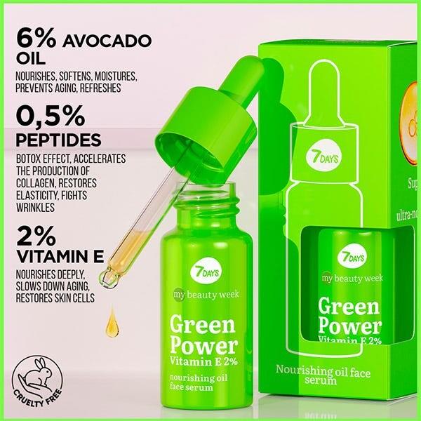 7DAYS GREEN POWER Активирующая сыворотка для лица с пептидамипредлагает безинъекционные омолаживающие процедуры: глубокое увлажнение, питание интенсивный, лифтинг , повышение твердости, эластичности, уменьшение морщин. Уход MY BEAUTY WEEK SMART – это сочетание интеллектуальных ингредиентов и инновационных формул, обеспечивающих 100% эффективность.