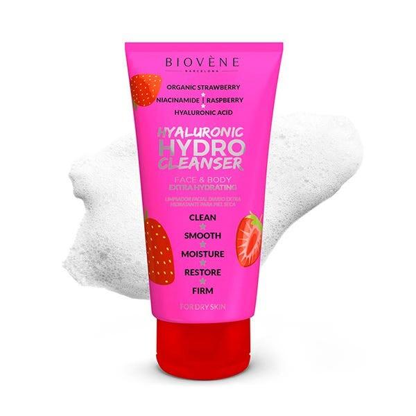 Особое увлажняющее очищающее средство для лица и тела с гиалуроновой кислотой и органической клубникой мягко очищает кожу и эффективно удаляет загрязнения /strong>, жир и грязь, восстанавливая упругость.