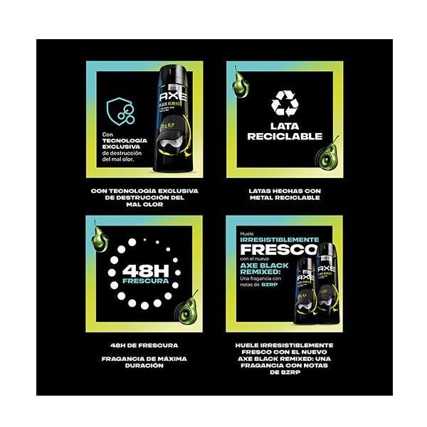 ДЕЗОДОРАНТ-СПРЕЙ ДЛЯ ТЕЛА AX BLACK REMIXED BZRP: Запах неотразимо свежий с новым AX BLACK REMIXED: ароматом с нотами BZRP. Новый Axe Black Remixed — это спрей для тела, который дарит взрыв свежих ароматов, включая ноты замороженной груши и кедра. Кроме того, он обеспечивает 48 часов защиты от неприятного запаха. Запуск Bizarrap делает его одним из лучших ароматов Axe на рынке.
