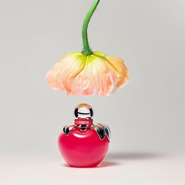 Знаменитый флакон в форме яблока от Nina приобретает яркий ярко-розовый оттенок и в качестве великолепного завершающего штриха украшается текстурированной розовой лентой с серебряными буквами.