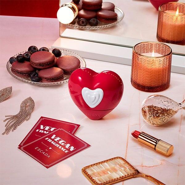 Его блестящий флакон в форме сердца доступен в объемах 30 мл, 50 мл и 100 мл. одет в красный бархат, напоминающий театральный занавес. Этот женский парфюм Escada представлен в эффектной коробке с принтом «любовь» по всей поверхности, имитирующим стиль классического бродвейского плаката.