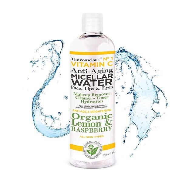 Сознательная Антивозрастная мицеллярная очищающая вода с антивозрастным витамином С, органическим лимоном и листьями малины мягко удаляет все следы макияжа, очищает, тонизирует и увлажняет > сильный>, чтобы ваша от природы мягкая, яркая и сияющая кожа снова появилась на поверхность.