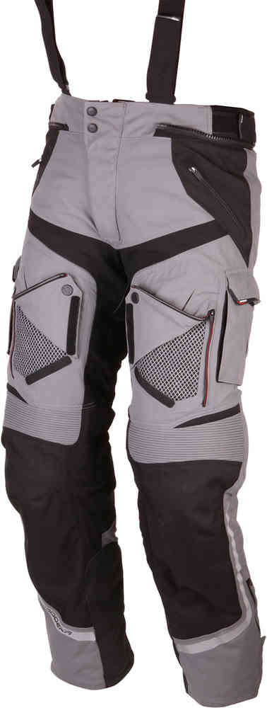 Мотоциклетные текстильные брюки Modeka Panamericana Особенности: 750 D Tactel® (100 % полиамид) 1000 D Cordura® усиления в зонах удара (100 % полиамид) Арамидная ткань на икрах для защиты от тепла Противоскользящий материал внизу Технология Air Draft : Вентиляционные карманы, управляемые сильными магнитами Вентиляционные молнии AirVent Отражатели 3M™ Scotchlite™ Съемная мембрана Sympatex®: 100 % водонепроницаемая, 100 % ветронепроницаемая, очень дышащая Съемная термоподкладка Регулируемые по высоте наколенники SAS-TEC (EN 1621-1) :2012, уровень защиты 2) Защитные устройства для бедер SAS-TEC (EN 1621-1:2012) съемные подтяжки 2 водонепроницаемых наружных кармана соединительная молния защитные швы