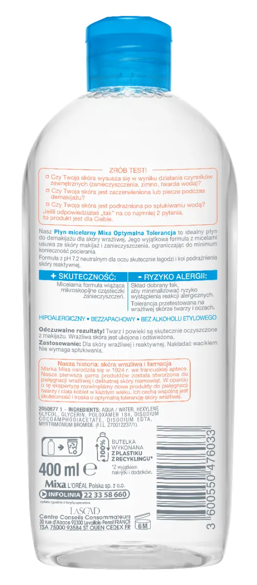 Мицеллярная жидкость Optimal Tolerance Mixa – препарат, который идеально подходит для снятия макияжа с чувствительной кожи, поскольку сводит к минимуму необходимость трения при снятии макияжа. Физиологический pH 7,2, идентичен pH кожи, не влияет на ее защитный барьер. Формула, обогащенная пантенолом, известным своими успокаивающими свойствами, мгновенно успокаивает раздраженную кожу. Мицеллярная формула связывает микроскопические частицы загрязнений. Состав подобран таким образом, чтобы минимизировать риск возникновения аллергических реакций. Переносимость проверена на чувствительной коже лица и век. Лицо и веки эффективно очищаются от макияжа. Кожа обновляется и успокаивается. Для реактивной кожи, склонной к покраснениям.