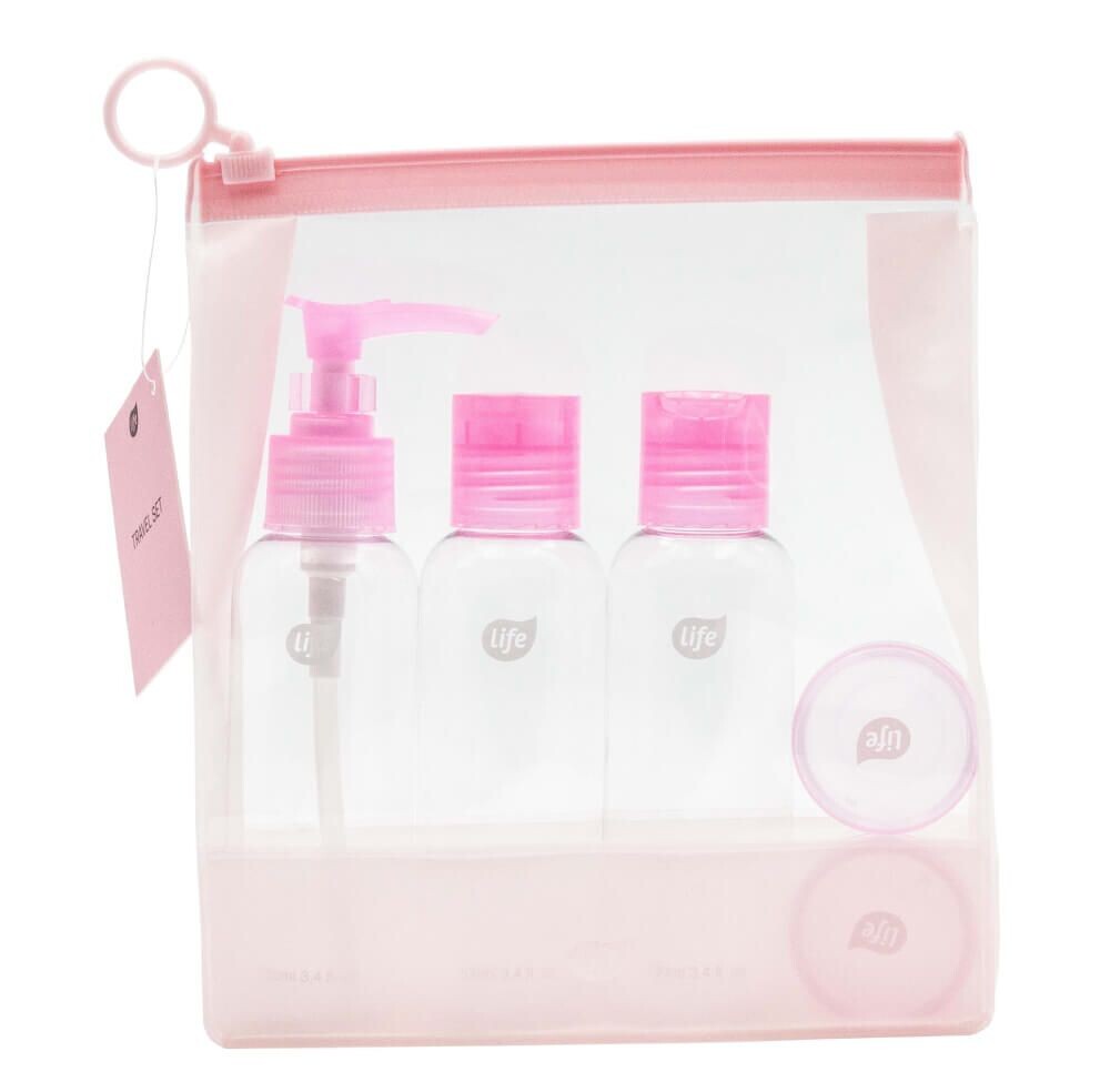 Флаконы и баночкиотлично помещаются в прозрачную розовую косметичку застегивается на молнию.молния. Все элементы дорожного набора Life Travel имеют розовые акценты, что значительно увеличивает удовольствие от их обладания. Независимо от того, короткая командировка ли это, поездка на выходные или отпуск, удобная косметичка с контейнерами для ваших сокровищ красоты станет идеальным решением.