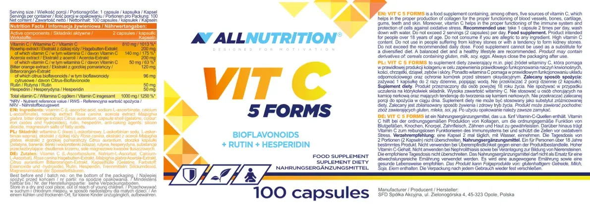 Allnutrition Vit C 5Forms представляет собой уникальную композицию из 5 форм Витамин С, обогащенный цитрусовыми биофлавоноидами, рутином и гесперидином. Пищевая добавка в капсулах, подходящая для веганов.