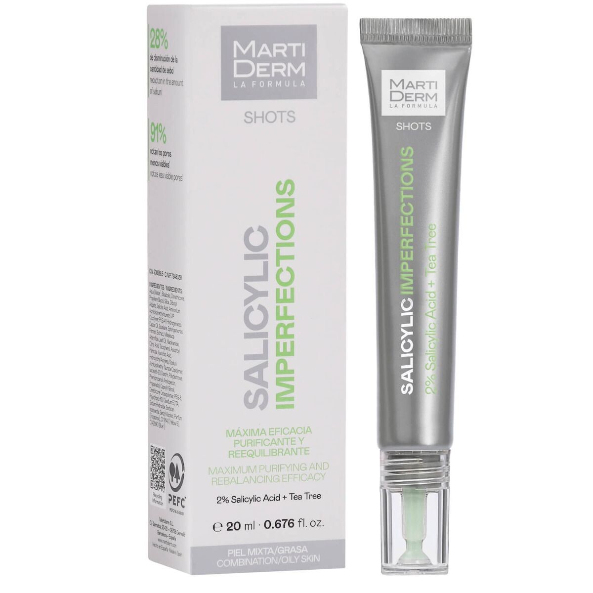 MartiDerm Shots Salicylic Imperfections — это концентрированная очищающая сыворотка для лица, которая была создана в ответ на потребности кожи, склонной к акне, жирной и смешанной. Формула косметического средства основана на синергическом действии активных компонентов: 2% салициловой кислоты и масла чайного дерева. Благодаря такому сочетанию сыворотка оказывает двойной эффект: устраняет несовершенства, а также восстанавливает баланс кожи и делает ее свежей.