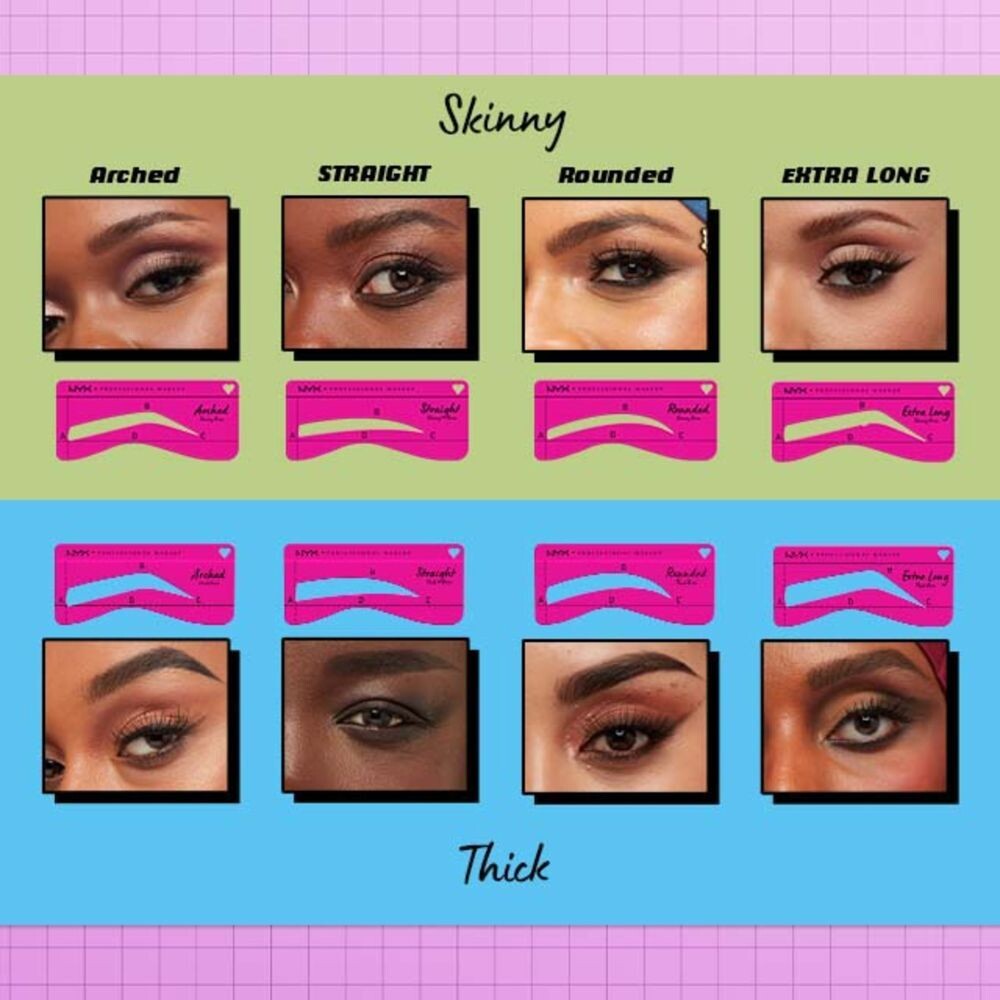 Измените внешний вид своих бровей с помощью новейших шаблонов Zero To Brow от NYX Professional Составить! Вы можете выбирать форму бровей: круглую, прямую, изогнутую или длинную. Проверьте, предпочитаете ли вы сдержанный вариант или чуть более выразительный. Используйте шаблон, соответствующий вашему естественному размеру бровей, чтобы исправить их форму или создать совершенно новый вид вашей оправы для глаз! Закрепить эффект можно гелем для бровей. Наслаждайтесь бровями своей мечты с помощью шаблонов NYX Professional Makeup Zero To Brow Thin!