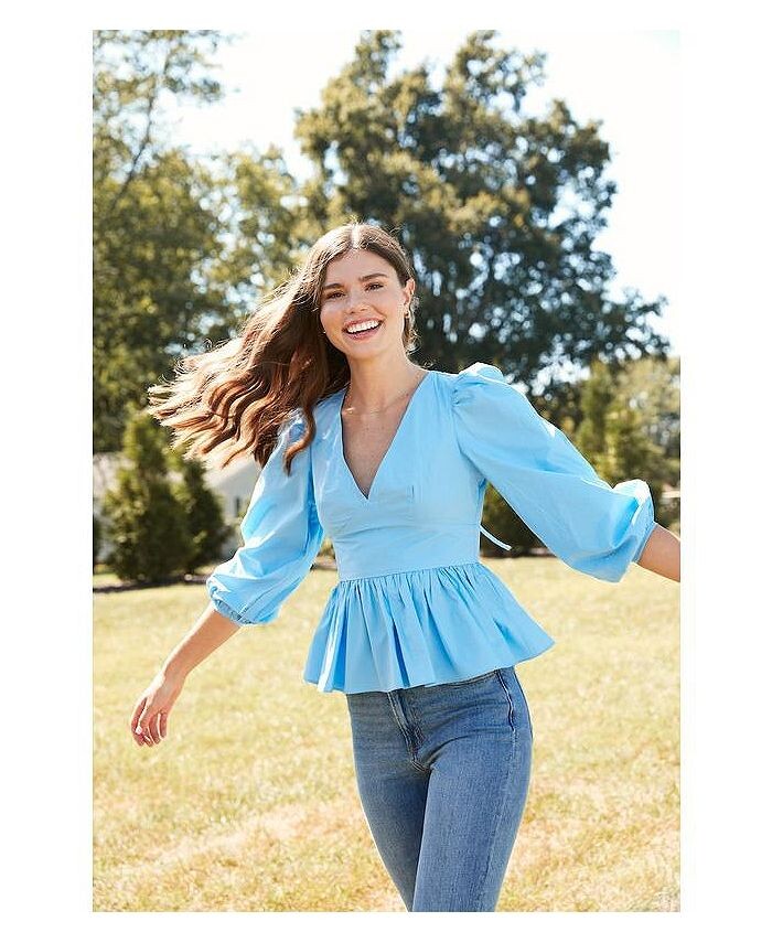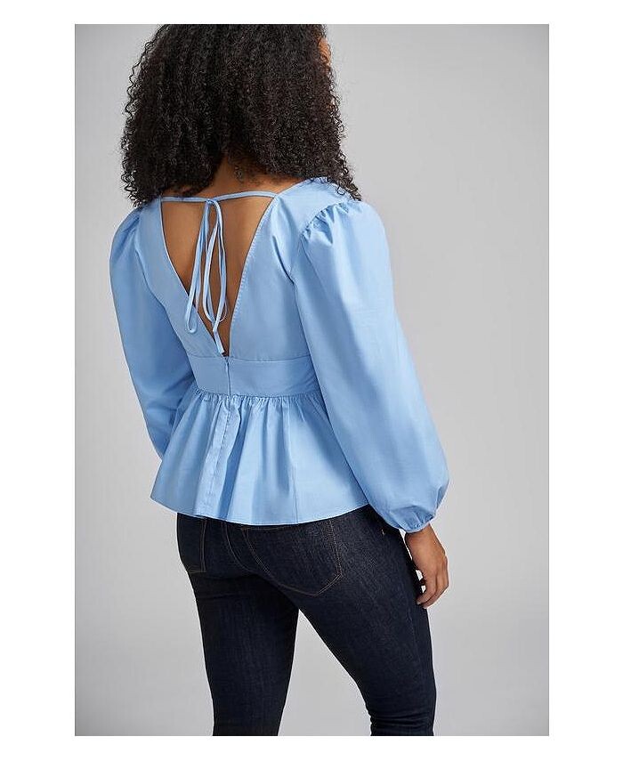 Наша небесно-голубая блузка Olivia с игривым V-образным вырезом и объемными рукавами-фонариками привлечет внимание. Вставка на талии и низ баски очень подчеркивают фигуру. На спине топа имеется глубокий V-образный вырез с завязкой. Это повернет головы вперед назад. Идеально подходит для игрового дня и не только.