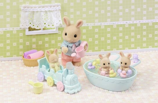 Набор для ванны для троих Sylvanian Families состоит из маленьких очаровательных фигурок животных, покрытых мягким бархатистым мехом. Тройняшки Бисквитного Кролика Исла, Ирис и Оуэн счастливы, когда наступает день купания. Айла любит плескаться в ванне, Айрис хорошо спит и может заснуть даже в ванне, Оуэн любит поезда. Иногда ему не хочется принимать ванну, тогда мама опускает его шлейф в ванну, и Оуэн тут же меняет свое мнение. В поезде места хватит всем троим. Мама также кладет в ванну кольца для плавания и уточек для купания. Фигурки и аксессуары можно комбинировать с другими наборами, домиками, транспортными средствами и аксессуарами Sylvanian Families.