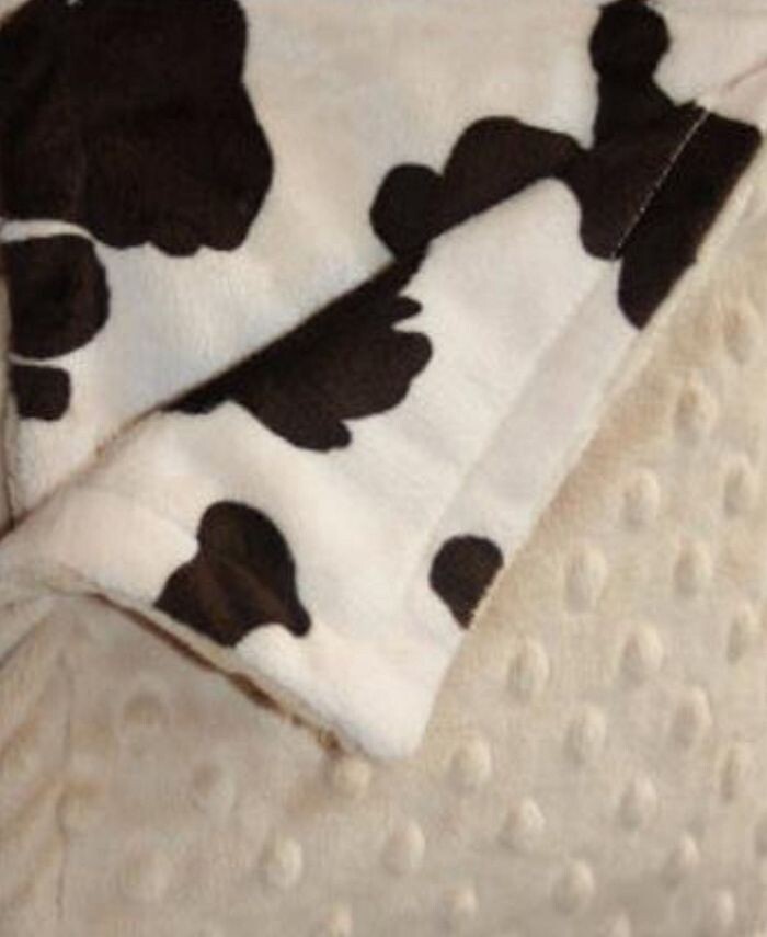 Это роскошное детское одеяло выполнено из минки с коровьим принтом на одной стороне и детской ямочки в горошек на другой стороне. Это одеяло идеально подходит для любителей ковбоев, ковбоев в стиле вестерн и сельскохозяйственных животных.