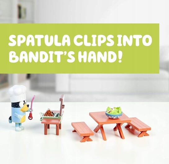 Бандит-папа Блюи готов к пикнику. Помогите ему приготовить вкусную еду на гриле с помощью мини-игрового набора на заднем дворе.
