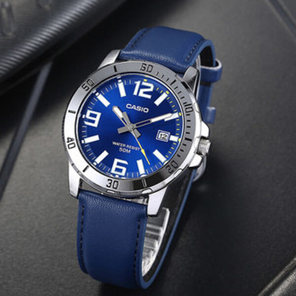 Часы CASIO Leather Band Waterproof Business Style Men Mens Blue Analog, синий