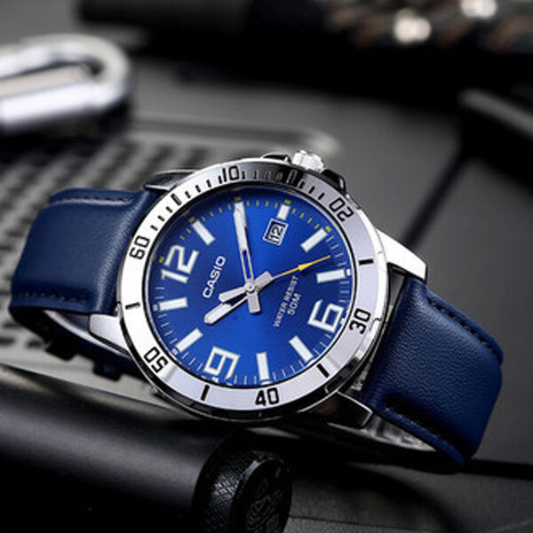 Часы CASIO Leather Band Waterproof Business Style Men Mens Blue Analog, синий 16 572₽